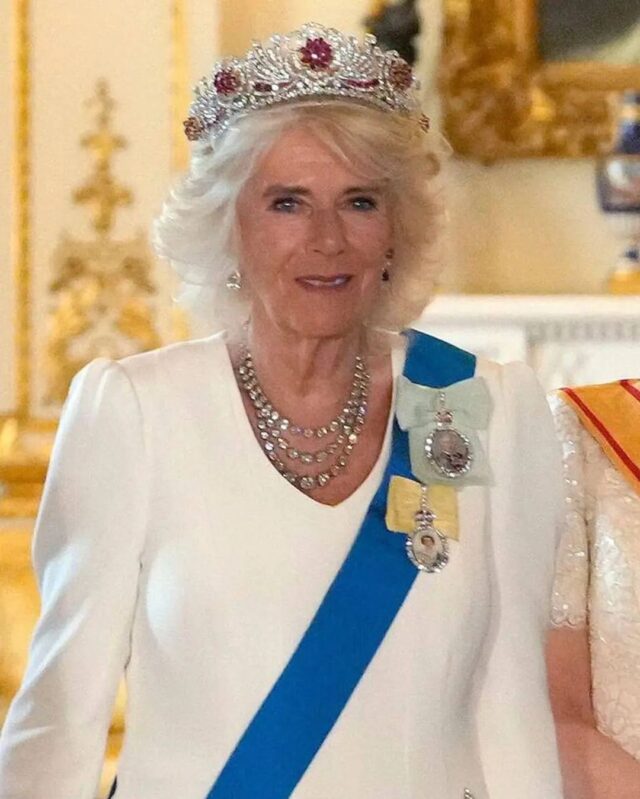 L’Empress is very elegant, beautiful evening gown. Camilla likes to decorate herself with Queen Elizabeth’s precious jewels – but it’s too much. Overdone.